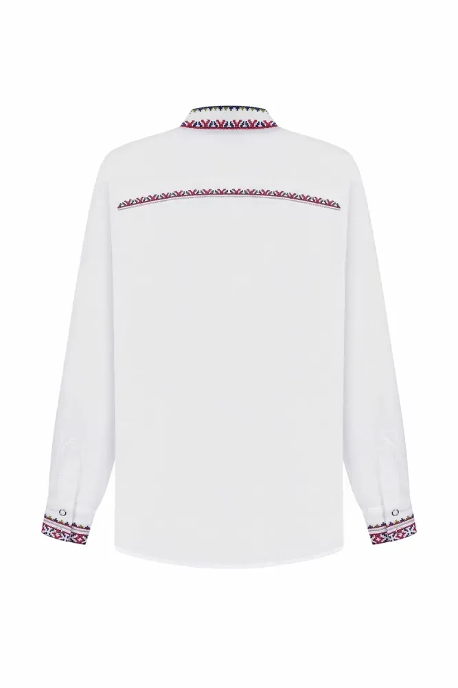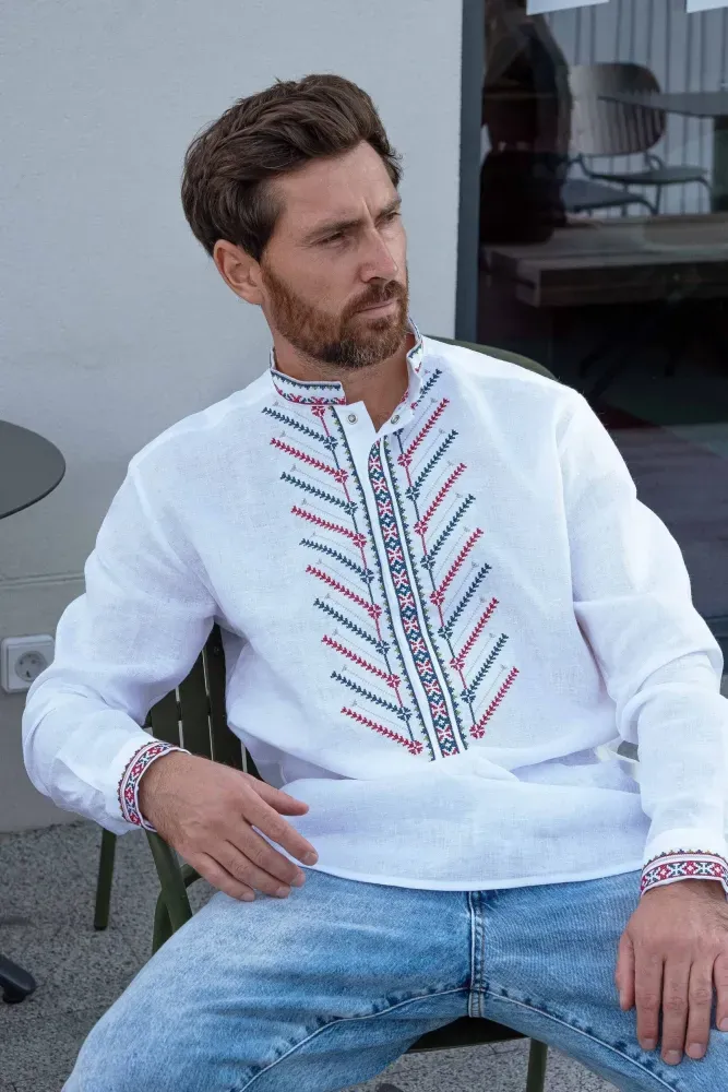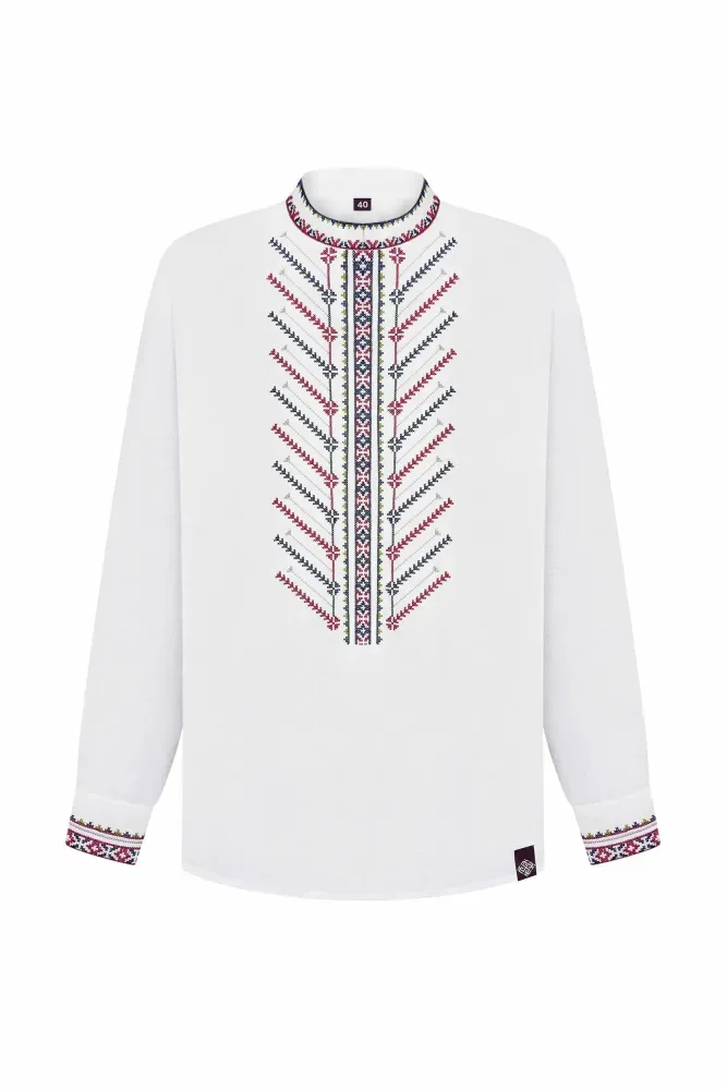 Ця вишиванка оздоблена рослинним орнаментом. На погрудді, манжетах та кокетці стилізовано гілки дерева і квітки волошок.