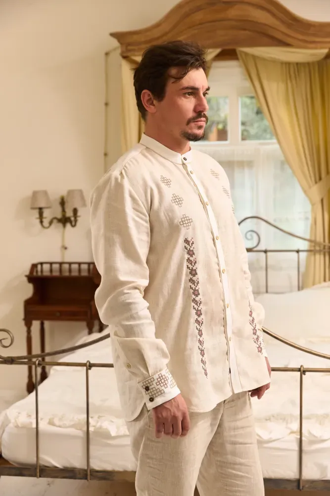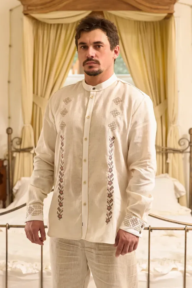 На вишиванці за допомогою машинної вишивки відтворено ручні техніки вишиття хрестиком та вирізування.