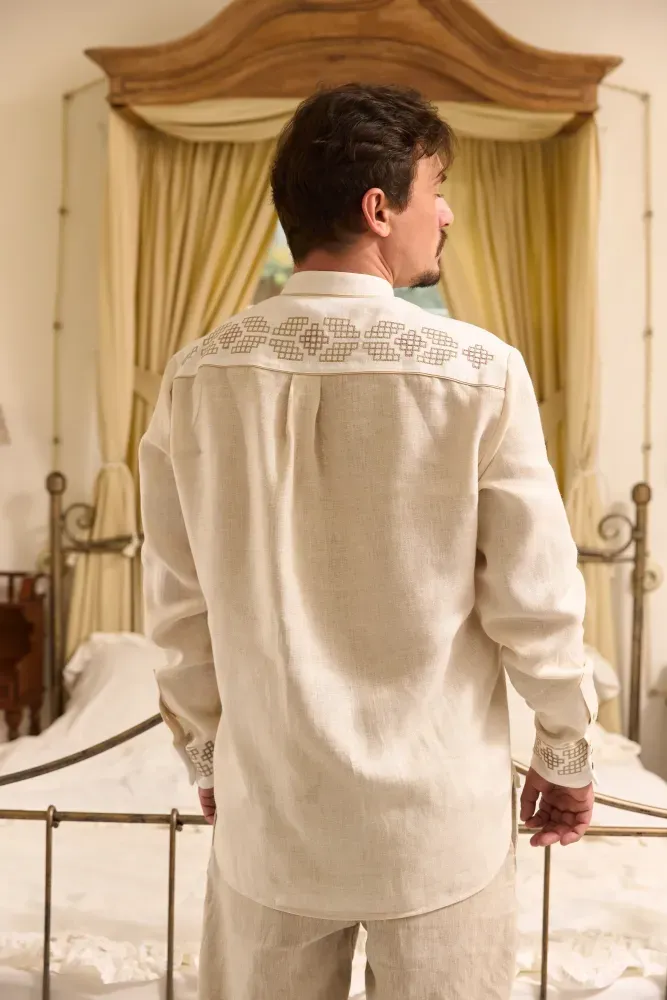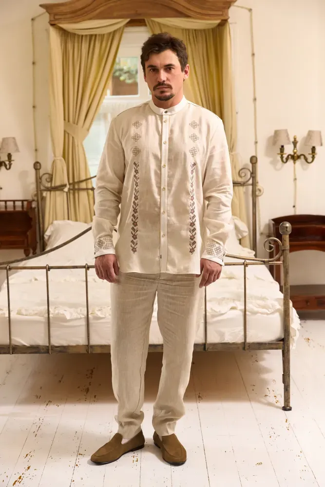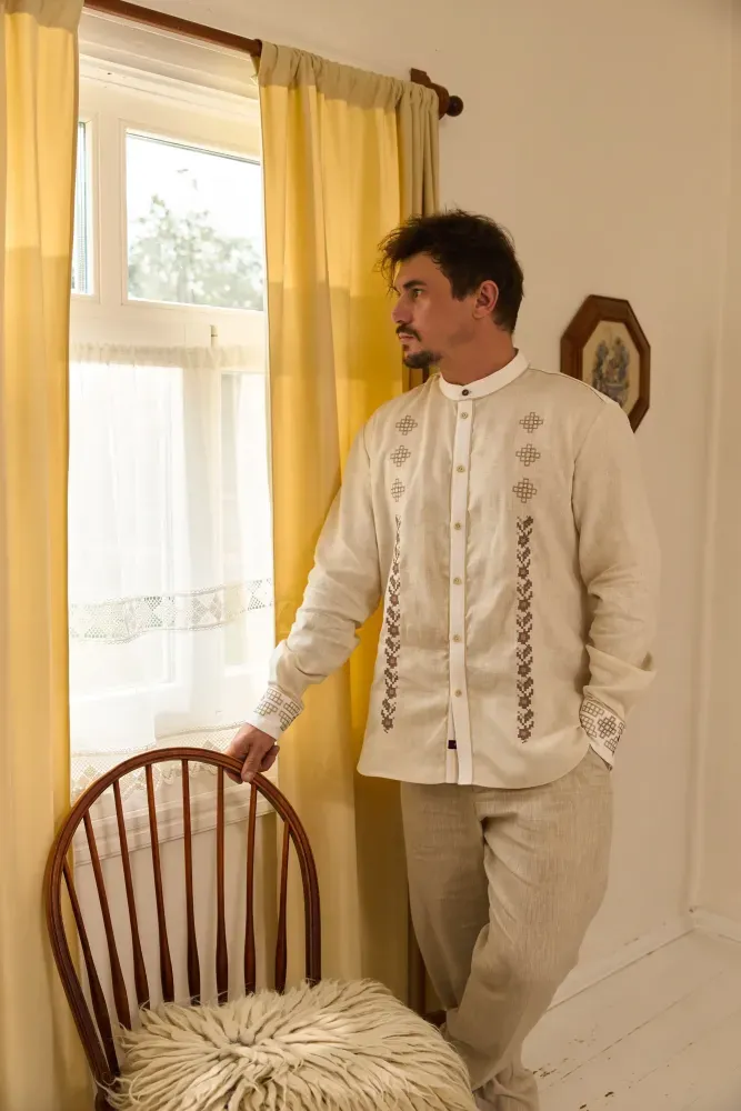 На погрудді вишиванки стилізовано вишиті гілки квіткових дерев у поєднанні геометричними композиціями. Манжети прикрашені геометричним орнаментом