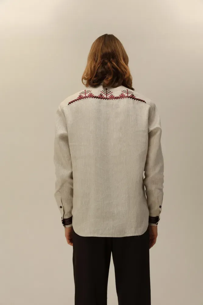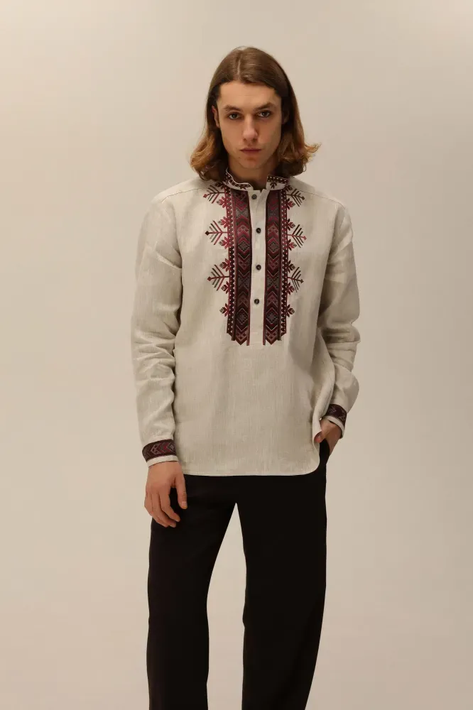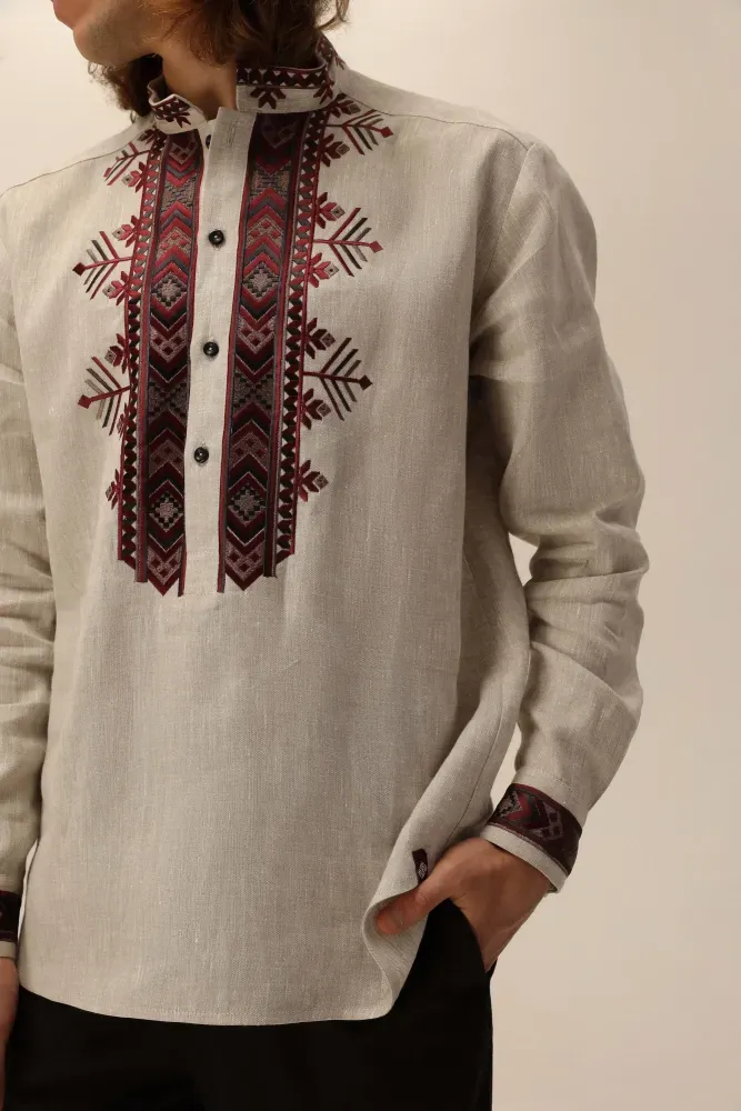 Застібається на ґудзики спереду та на манжетах. Візерунок створено машинною вишивкою з імітацією ручних технік вишиття.