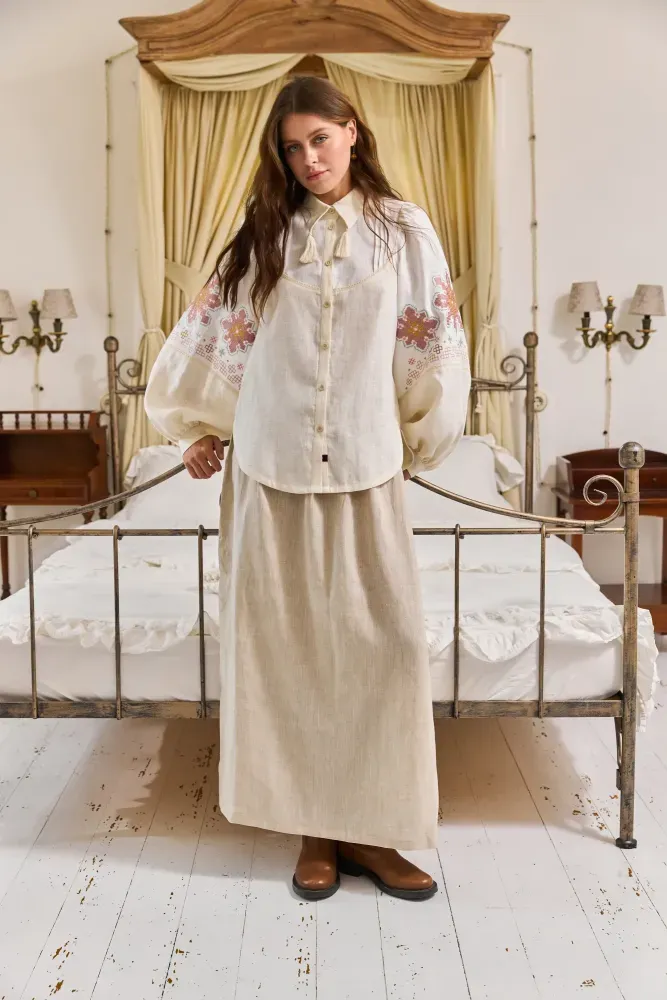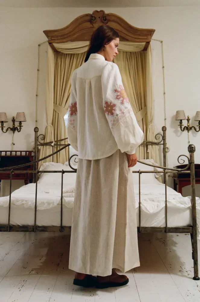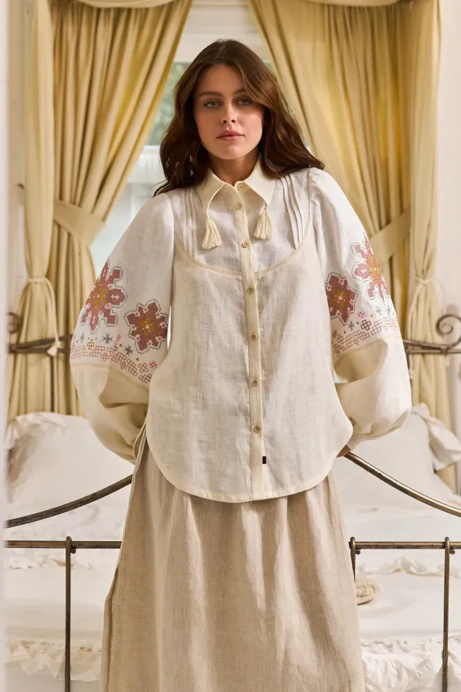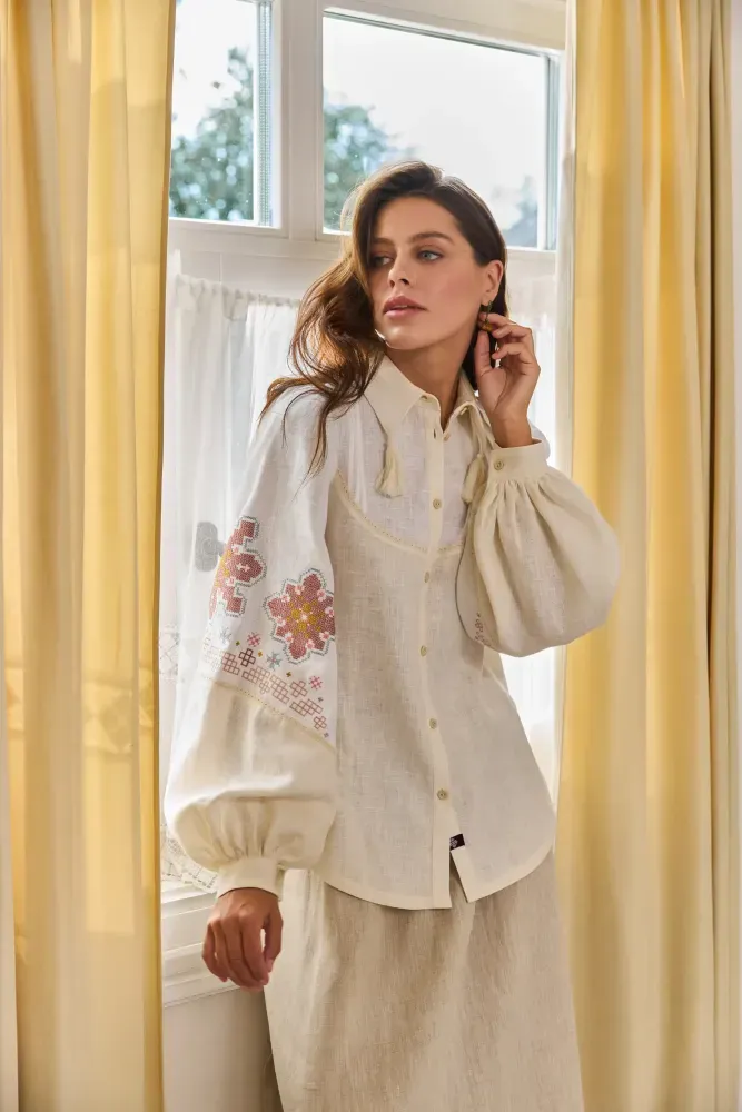 На вишиванці за допомогою машинної вишивки відтворено ручні техніки вишиття хрестиком та вирізування.