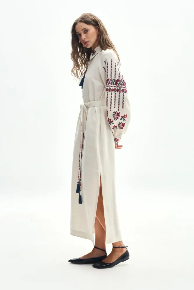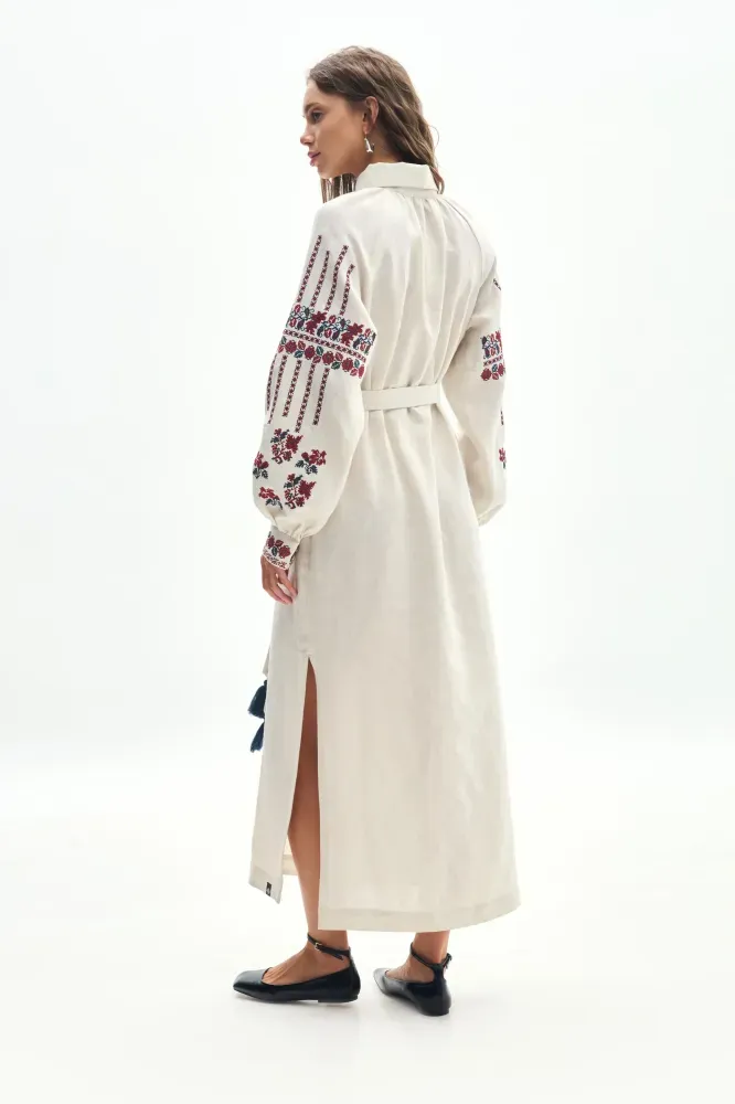 Традиційно на вишиванках Луганської області простежується поєднання декількох технік одночасно. На цій вишитій сукні за допомогою машинної вишивки відтворено ручні техніки вишиття: хрестик, шеляжок, штапівка.