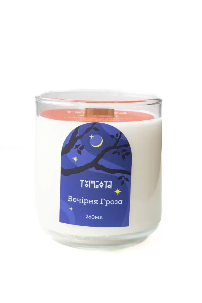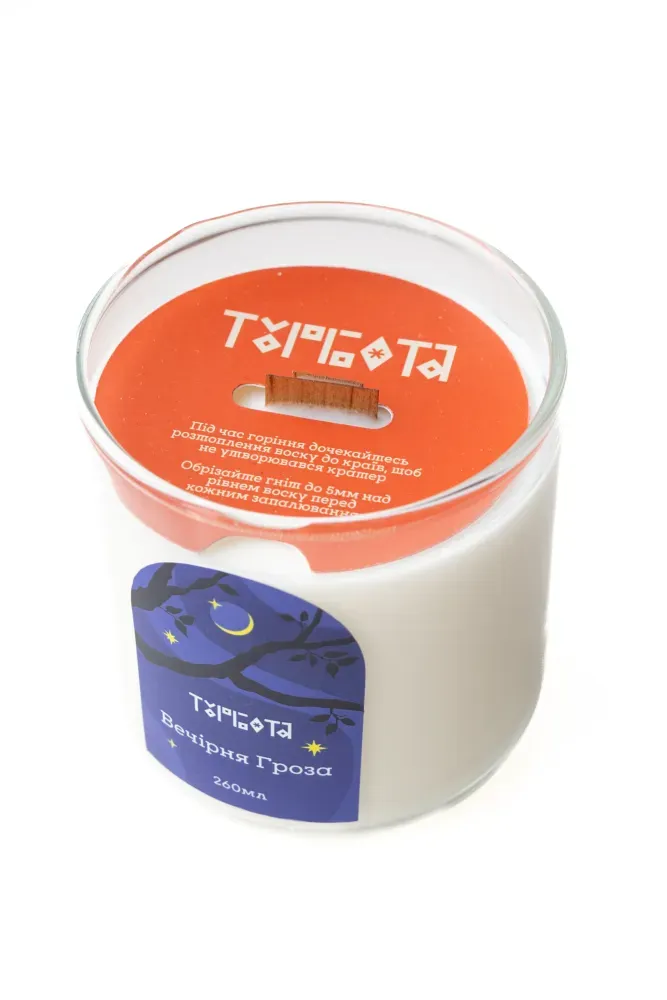 Зануртесь у атмосферу містичної вечірньої грози зі свічкою "Вечірня гроза". Аромат, що переносить у свіже, прохолодне повітря після дощу, наповнений чистотою та енергією природи. Свіжі верхні ноти озону, яблука і лимону надають аромату бадьорості, тоді як середні акорди шавлії та евкаліпта дарують відчуття заспокоєння і гармонії. Завершення композиції — теплі відтінки бурштину і пачулі, що створюють затишну атмосферу, немов після грози, коли земля ще зберігає аромат дощу.