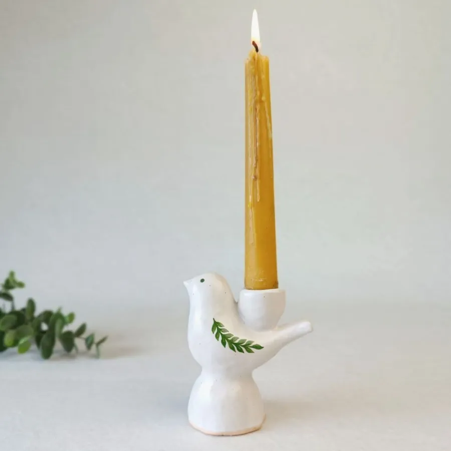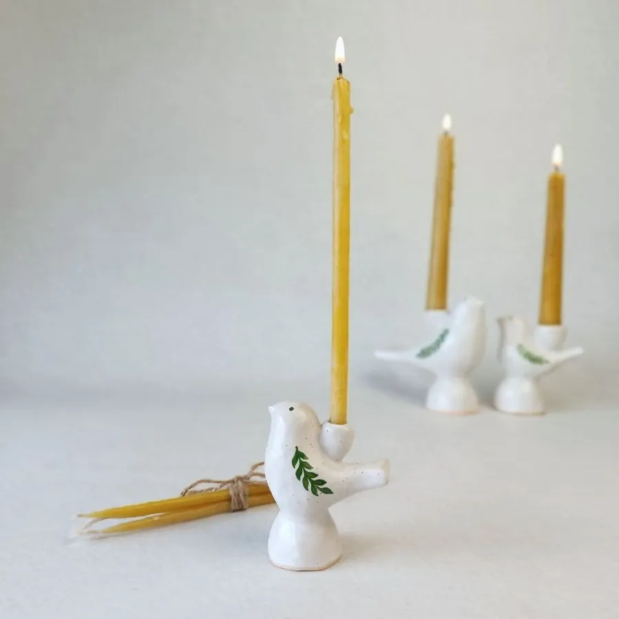Символічні фігурки птахів, які несуть у дім світло та гармонію. Кожен підсвічник прикрашений ручним розписом у вигляді зеленої гілочки, що підкреслює витонченість ліній та чистоту матеріалу.