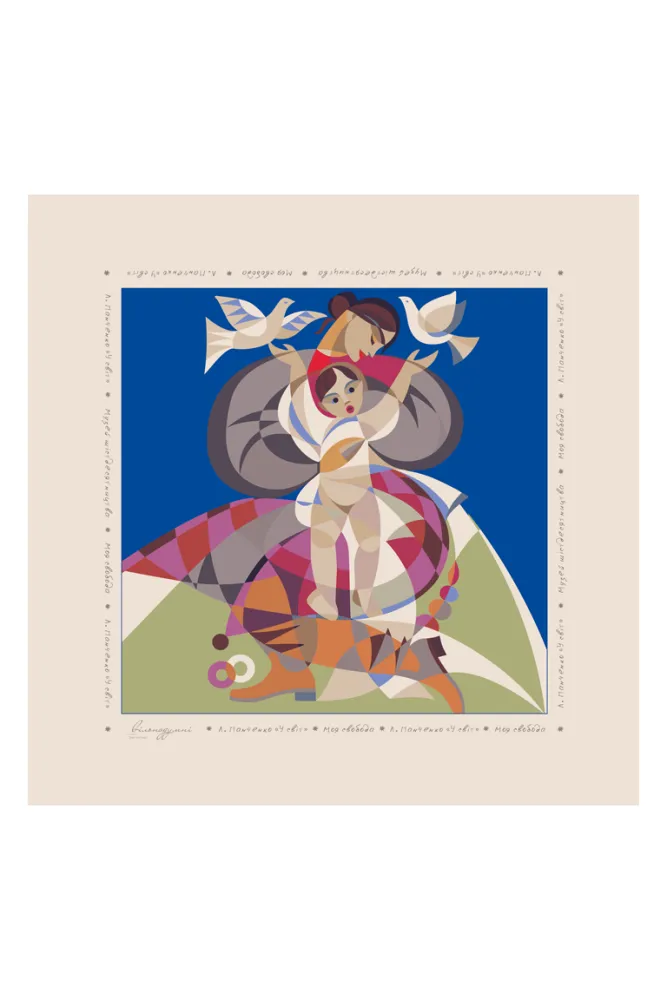 На хустці зображено картину Л. Панченко “У світ”, це колаж виконаний із пальтової тканини. Зараз ця картина як і весь доробок
