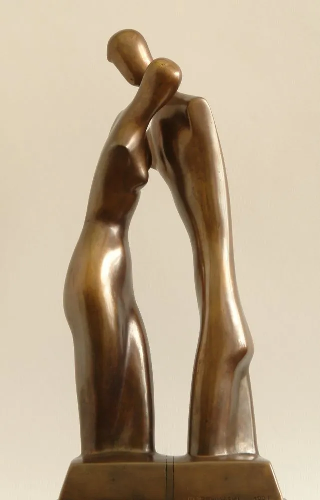 Дві узагальнені постаті — чоловіча та жіноча — нахилені одна до одної в тихому, майже нерухомому поруху. У цій миті зупиненого руху відчувається напруга очікування, ніжність доторку, таємниця почуття.
