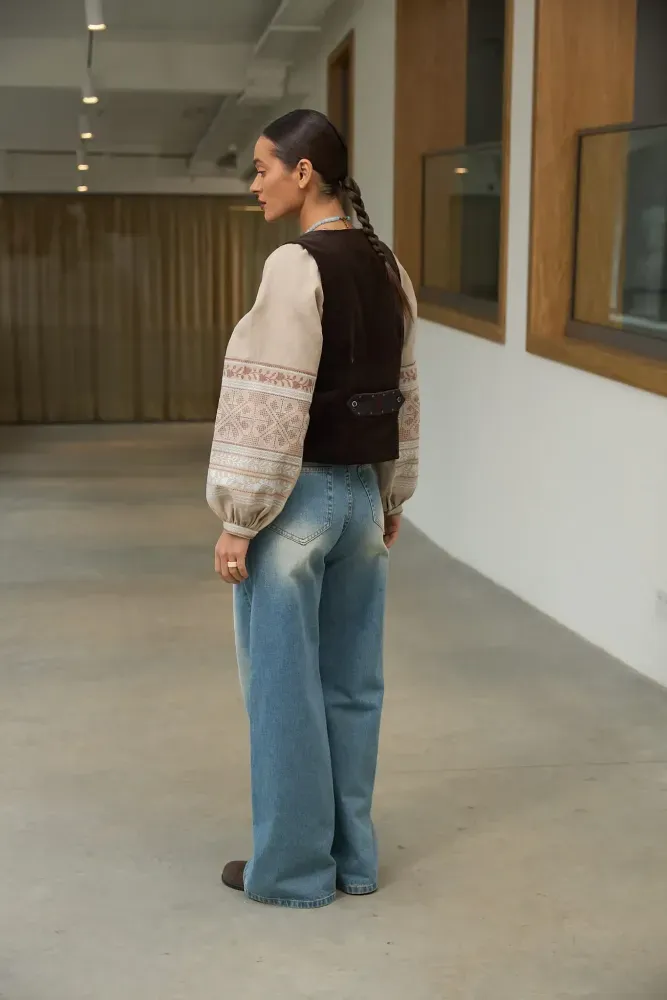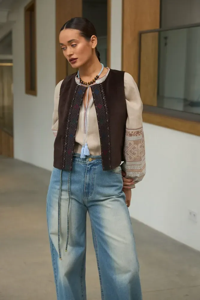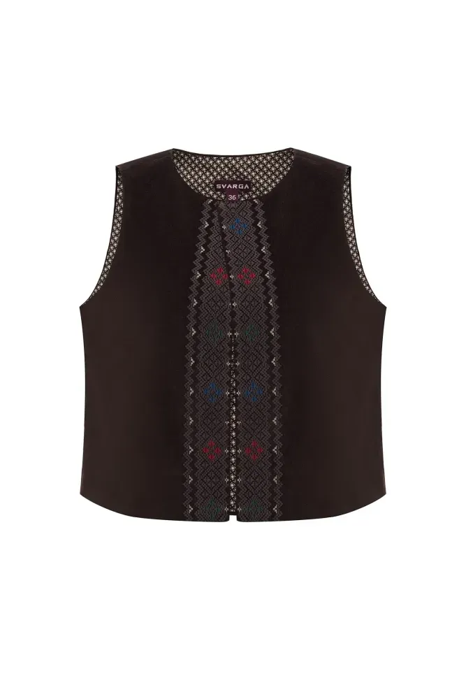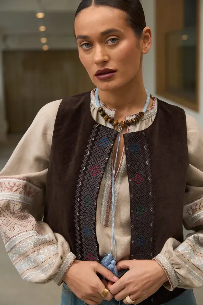 На передній планці жилетку оздоблено смужками орнаменту зі старовинної вишиванки містечка Гайсин, Вінницької області, що на Поділлі. На спинці жилетку задекоровано вишитим хлястиком.