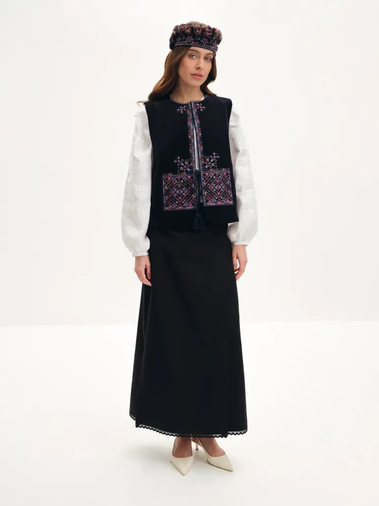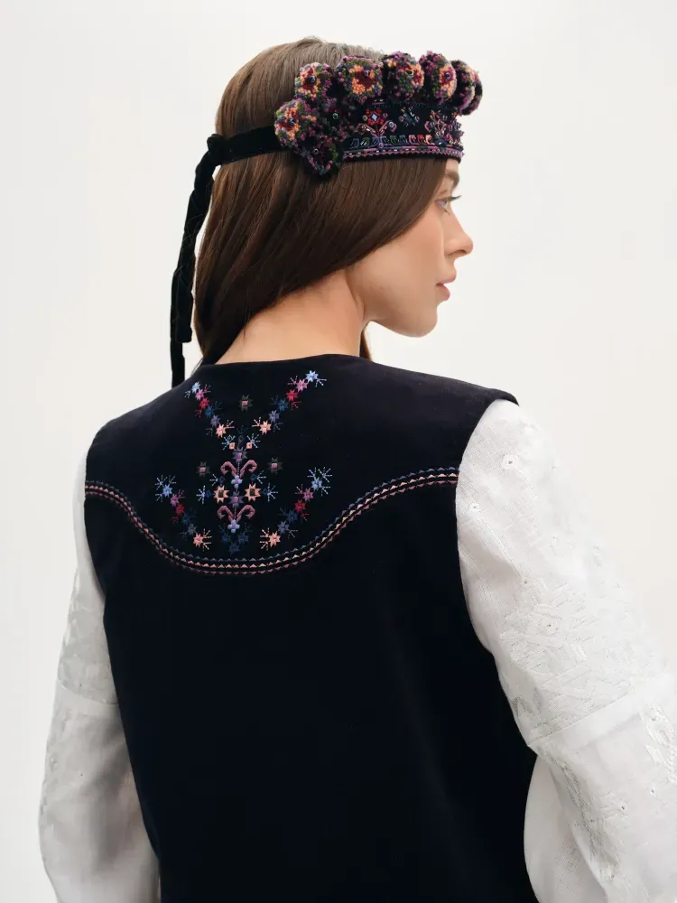 Гуцули називають чорницю яфинами або афинами, і саме її насичений, глибокий колір став натхненням для відтінку вишивки на жилетці.
