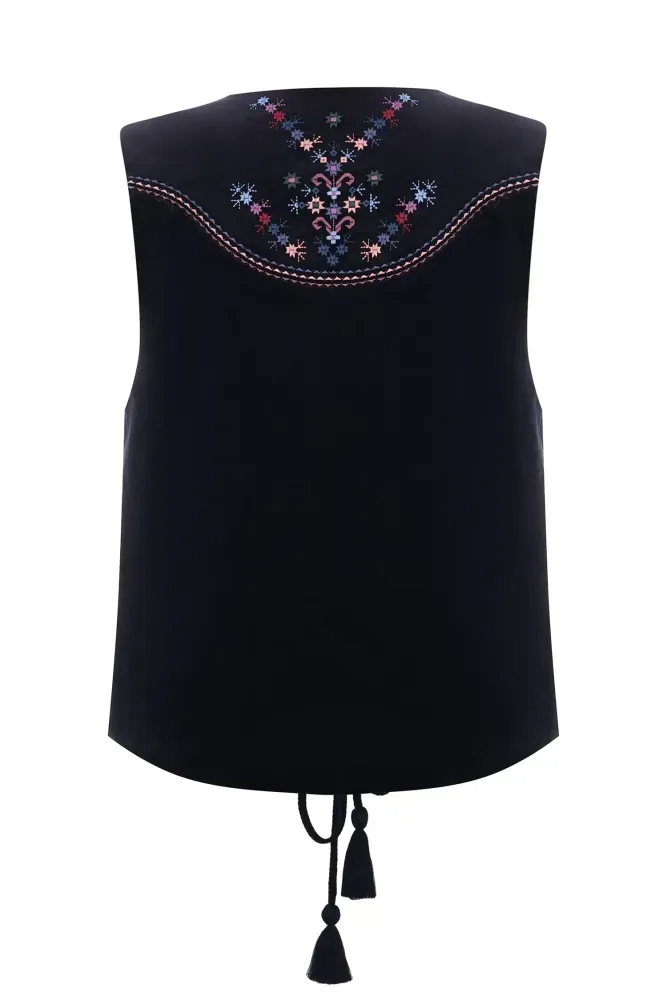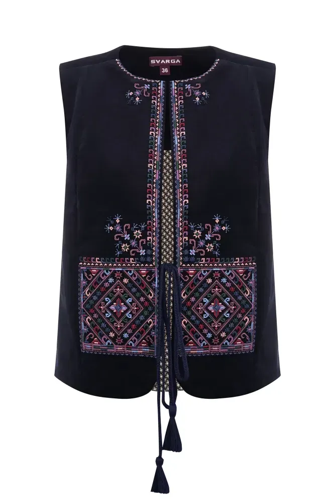 На жилетці розташований орнамент гуцульщини, Верховинського району. Виріб виготовлений із темно-синього оксамиту, зав’язується на китиці синього кольору.